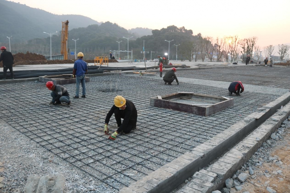 截止今日,南廣場鋪設(shè)塘渣完畢,路基混凝土已澆筑1/3,線性水溝南側(cè)與已澆筑路基之間場地平整結(jié)束,路基平鋪鋼筋網(wǎng)片加固扎捆完畢,等待夜間澆筑;臺階踏步花崗巖鋪設(shè)正在進行中;配套綠化土層平整完畢,等待綠化種植。
