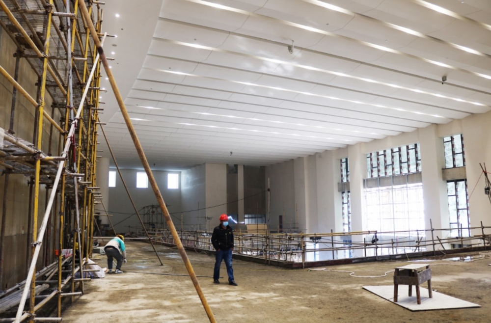 目前會議中心前廳的吊頂GRG和大理石干掛已完工,電梯安裝完畢,進入運行調試階段;觀眾廳施工方案經重新優(yōu)化后,地板龍骨進入鋪設階段,空調取孔和送風管安裝也已完成,整體效果已初步顯現。