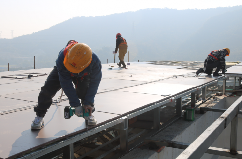 屋頂鋁板施工現場,工人們正熟練的將鋁板鋪設到龍骨架上,檢查、調整、校正、固定、封防雨條,涂防水膠。截至今日,屋頂鋁板東、南兩側已鋪設完成。